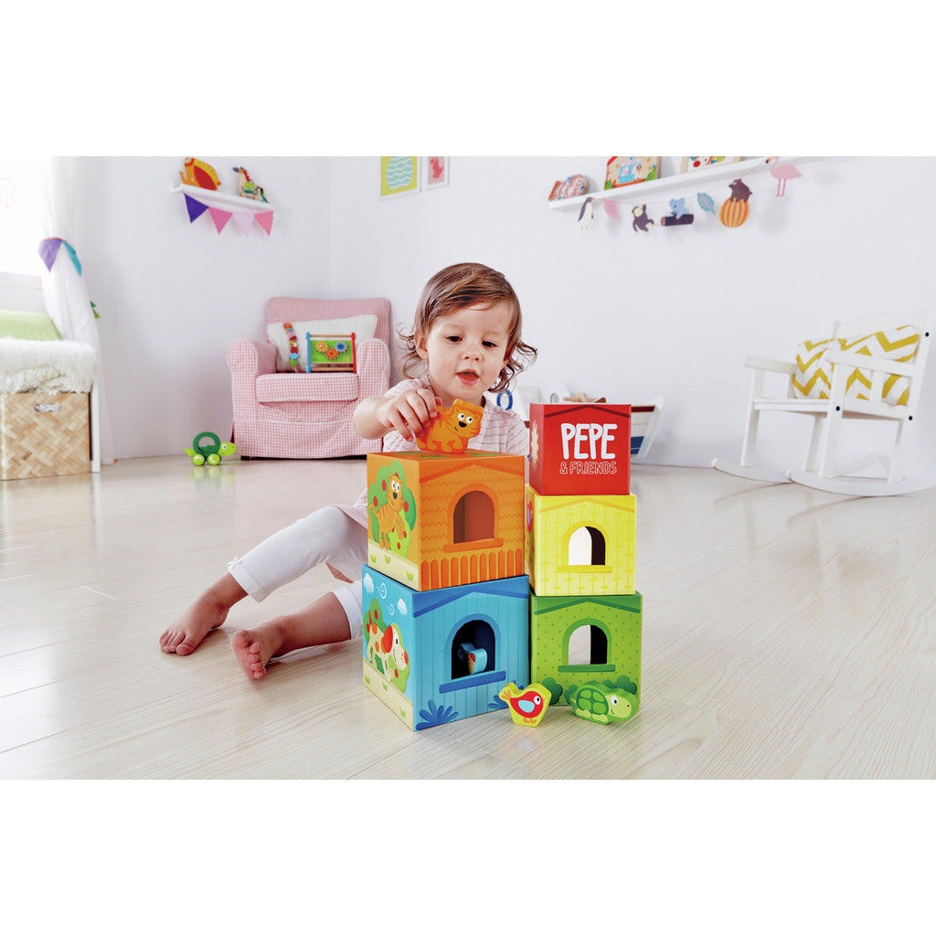 Los Cubos Apilables Sol y Campo Hape están diseñados para que los niños aprendan mientras juegan. Este juego de bloques coloridos promueve el desarrollo cognitivo, la motricidad fina y el reconocimiento de números, tamaños y animales, todo en un diseño inspirado en un valle soleado y lleno de vida.